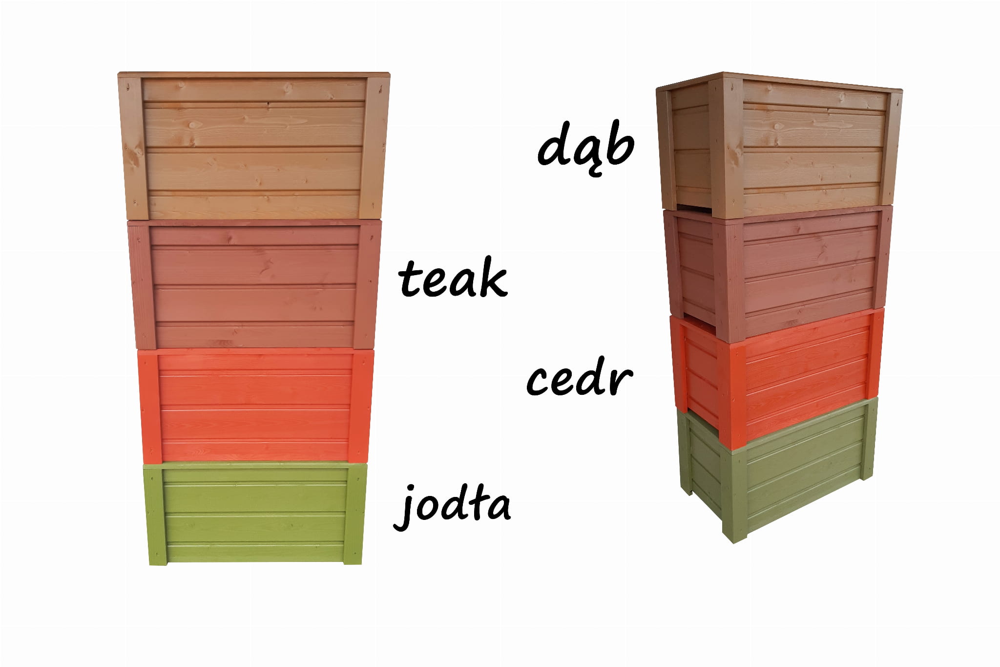Dostępna szeroka gama kolorów pokazana na zdjęciach umożliwia dopasowanie donicy do elewacji domu, koloru ogrodzenia, wykończenia balkonu, czy koloru innych mebli.